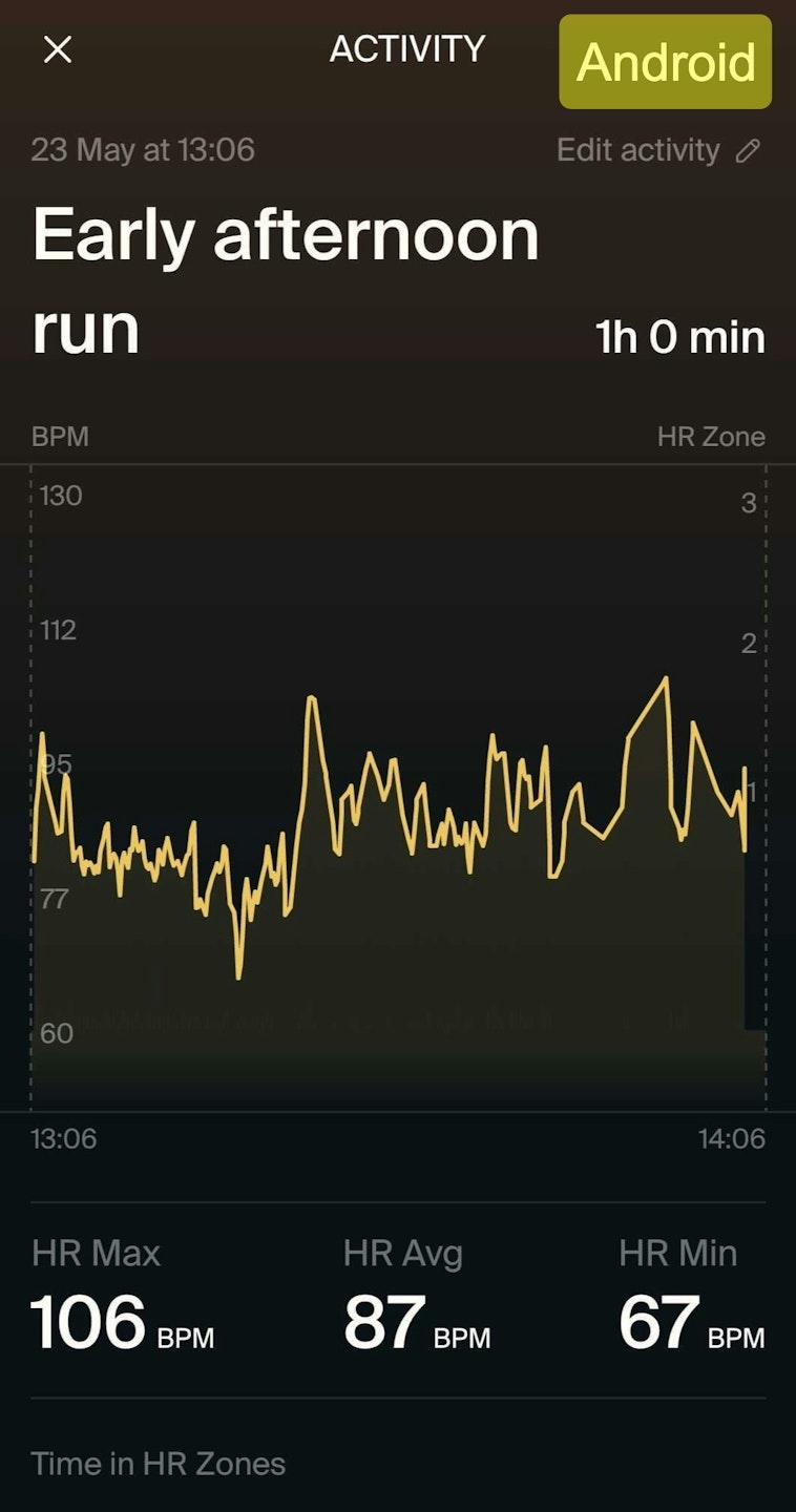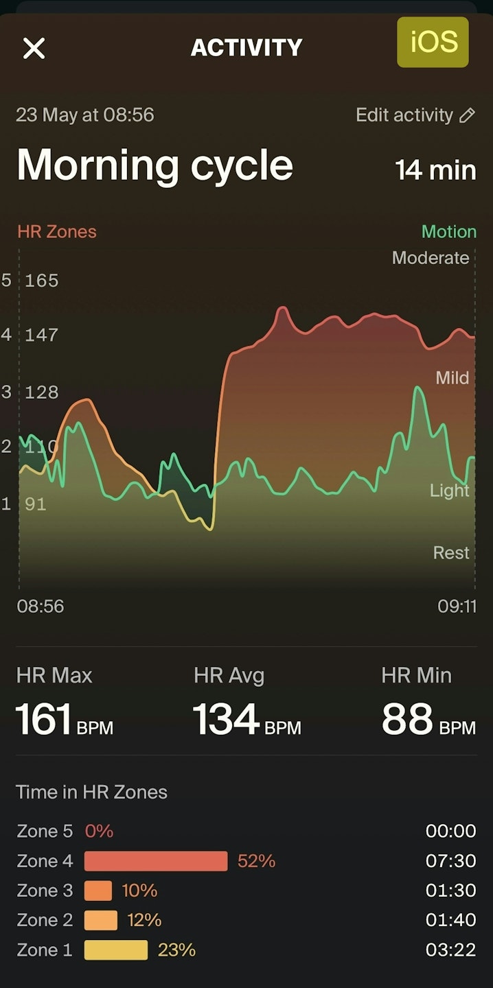 Time in HR Zones (1-5): A breakdown of how much time (and what percentage of the session) you spent in each heart rate zone — helpful for understanding workout intensity distribution.