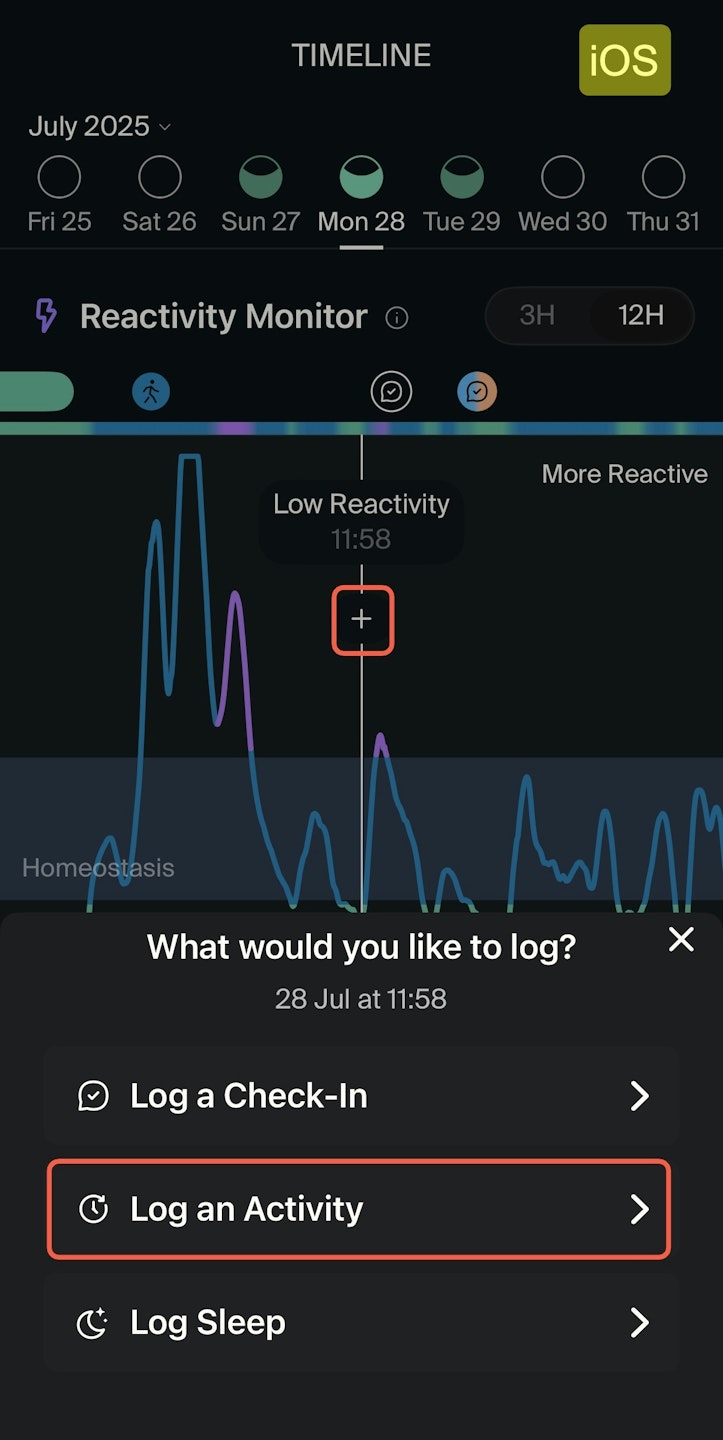 In the Timeline tab, use the cursor to navigate to a specific time on any chart, then tap the + icon and select Log an Activity. This option is specially useful to log an activity after it's finished, just make sure to adjust the start and end times accordingly. Logging an activity through the Timeline is only available on iOS devices.