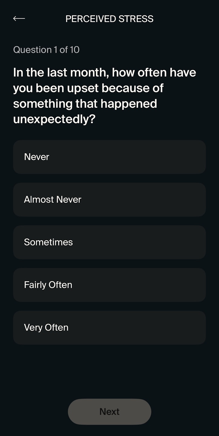Now that you've created your account, are connected to the app, and filled out key information, it's time to complete a short, 5-minute perceived stress questionnaire.