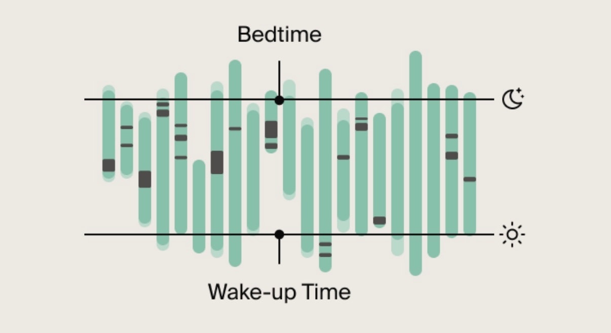 • Irregular sleep: Green bars are outside both icon lines.
