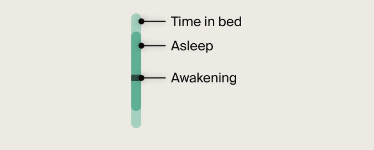 • Asleep and Time in bed: The dark green color shows the time you were asleep, while the light green color indicates the time you were lying in bed but not sleeping. If you see black (in light mode) or white (in dark mode), this represents the time you were awake.