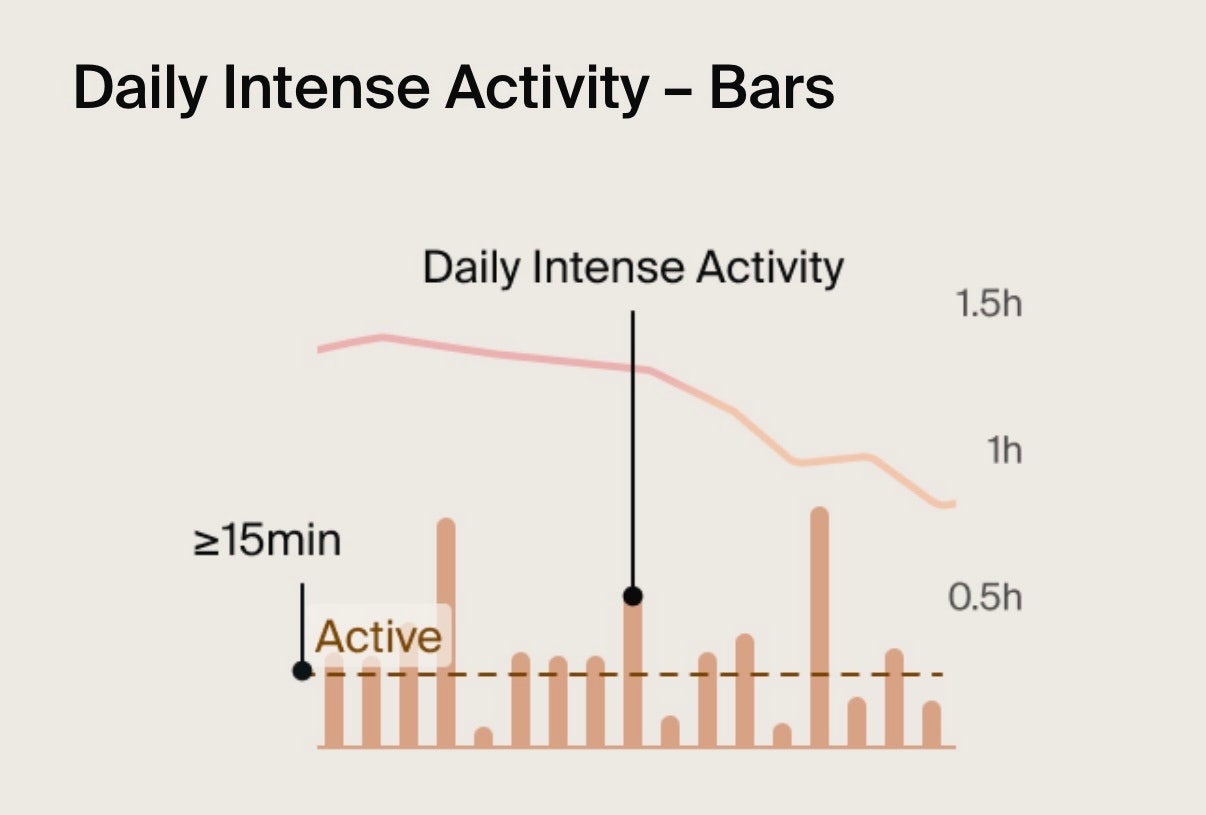 • Orange bars: Represent the duration of time spent doing intense activity each day.