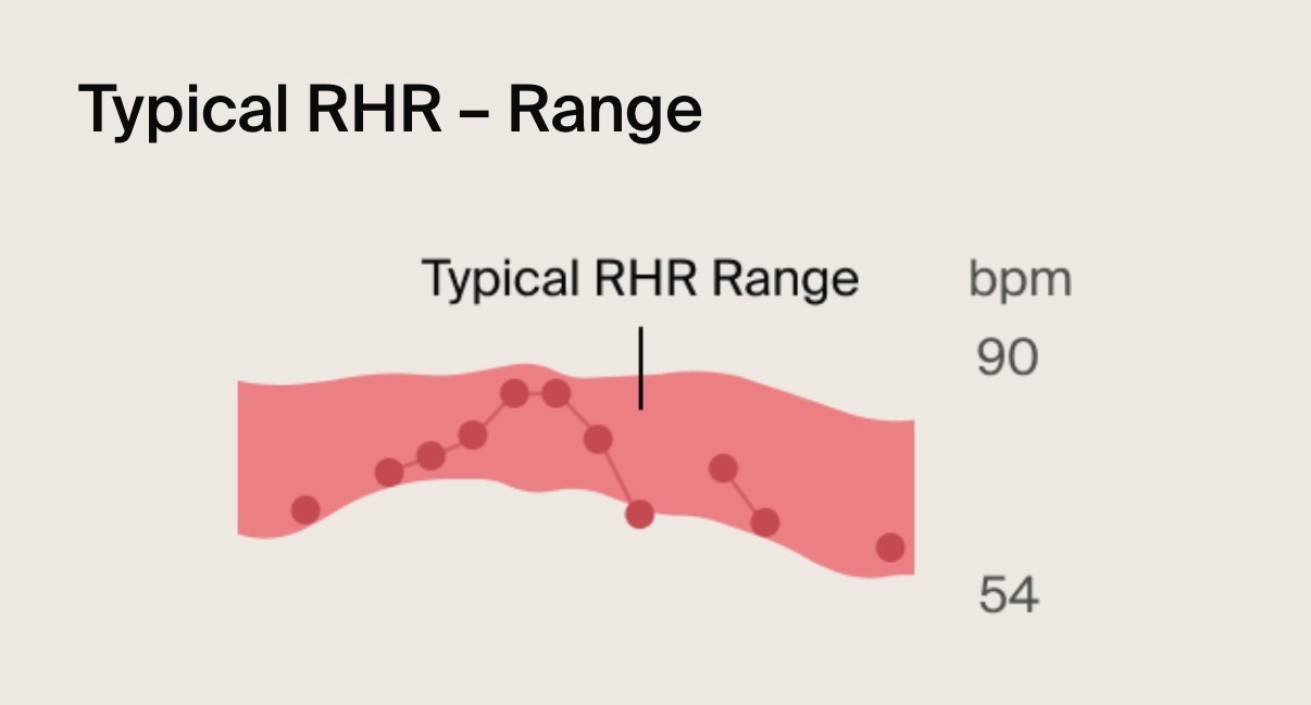 • Highlighted red area: Represents your Typical RHR Range. This is what’s normal for your body when you’re feeling well. You can use it as your personal baseline to help recognise patterns.