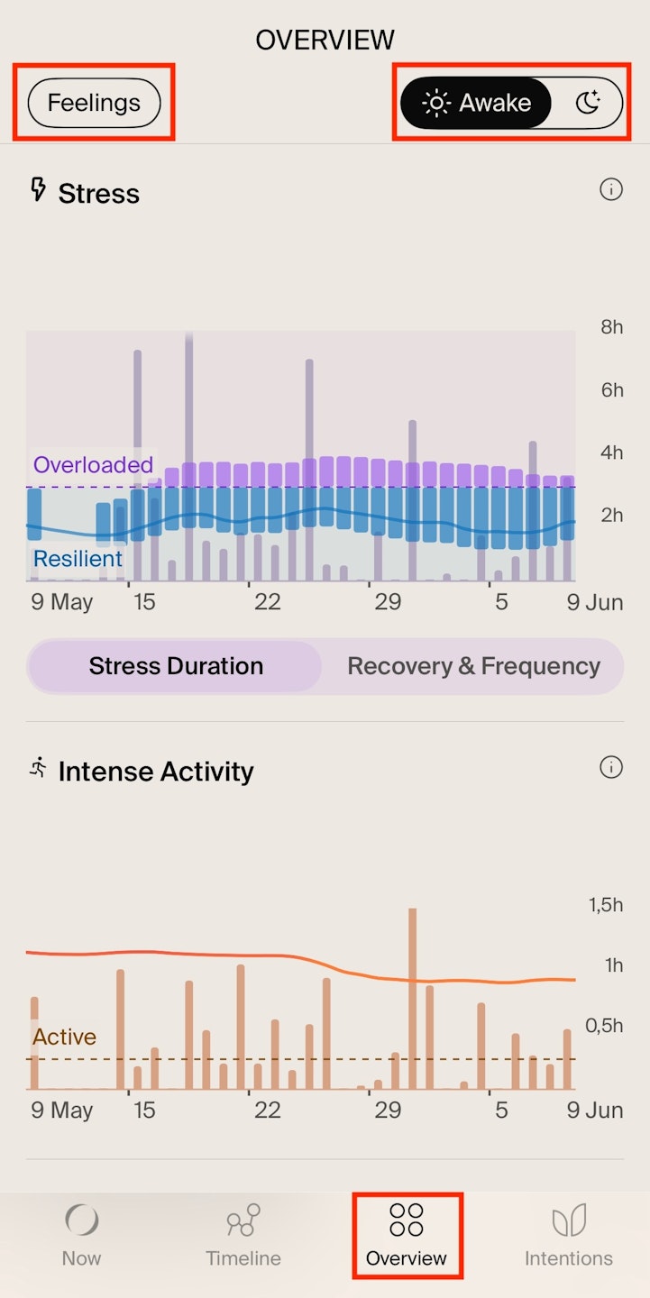 Feelings tab (top-left corner): Tap to track how you’ve been feeling each day. What you see here is based on your responses to the daily check-in questions—like “How was your day?” and “How did you sleep?”—which appear in the morning and evening.