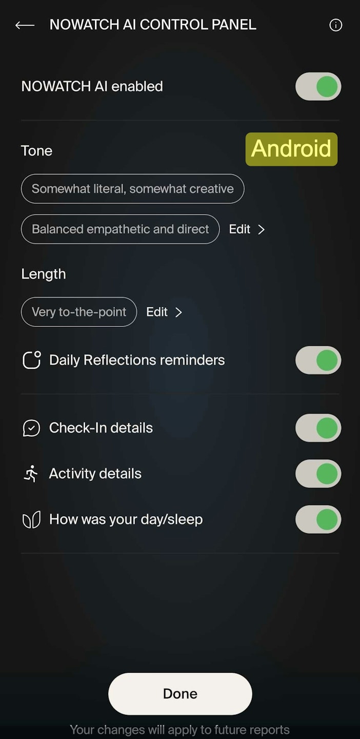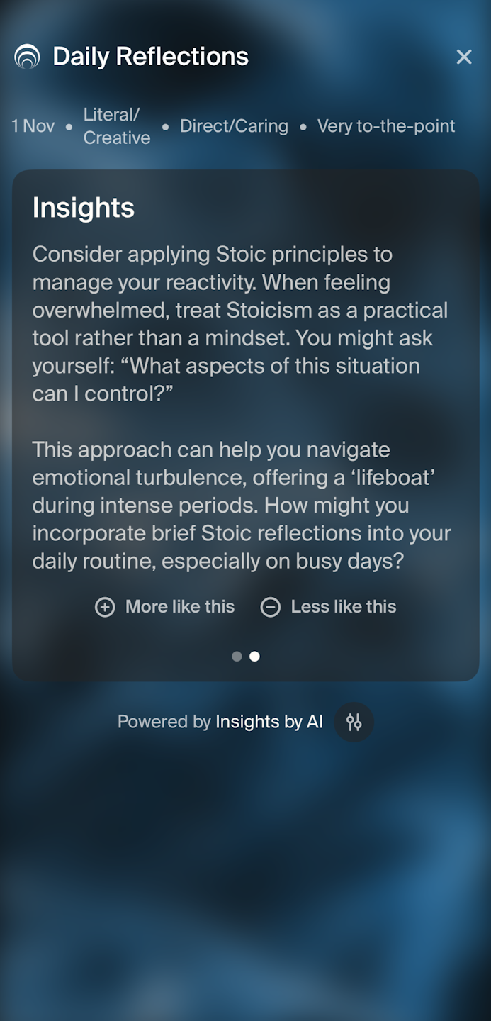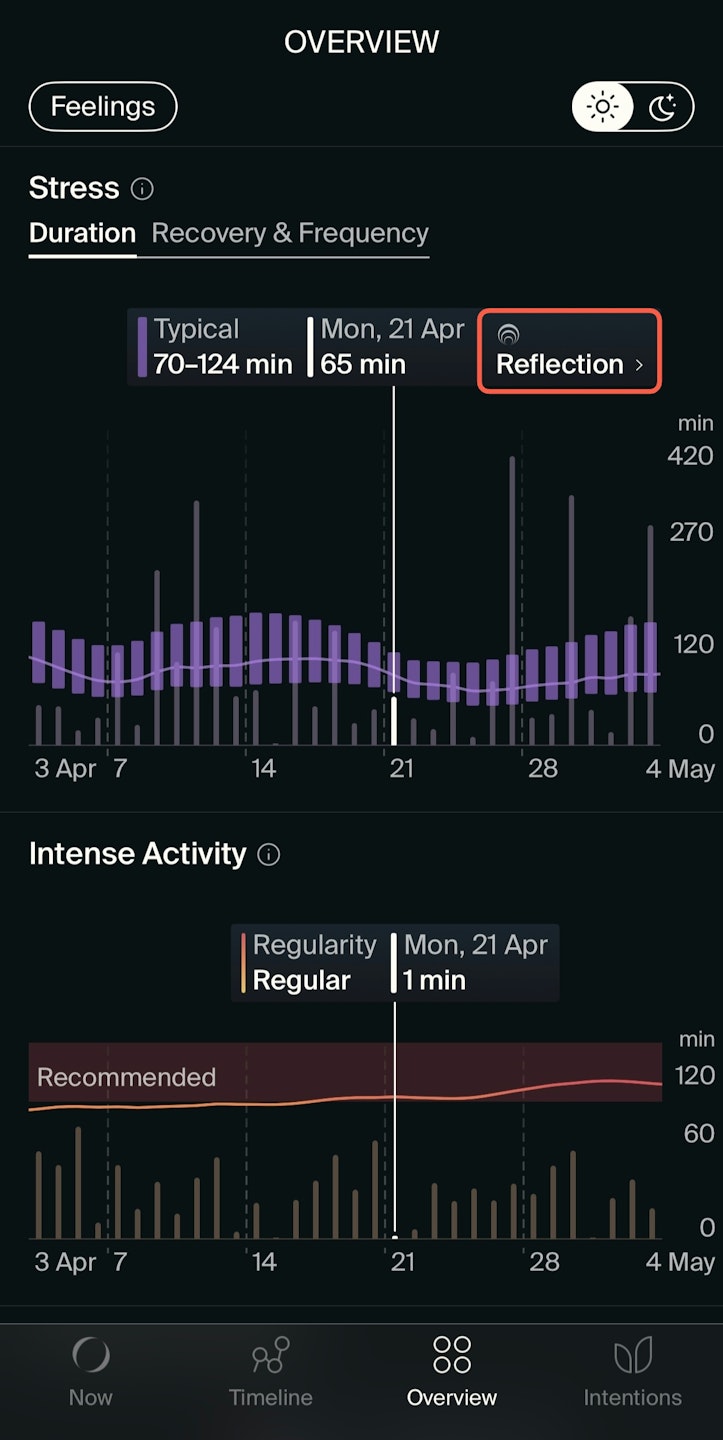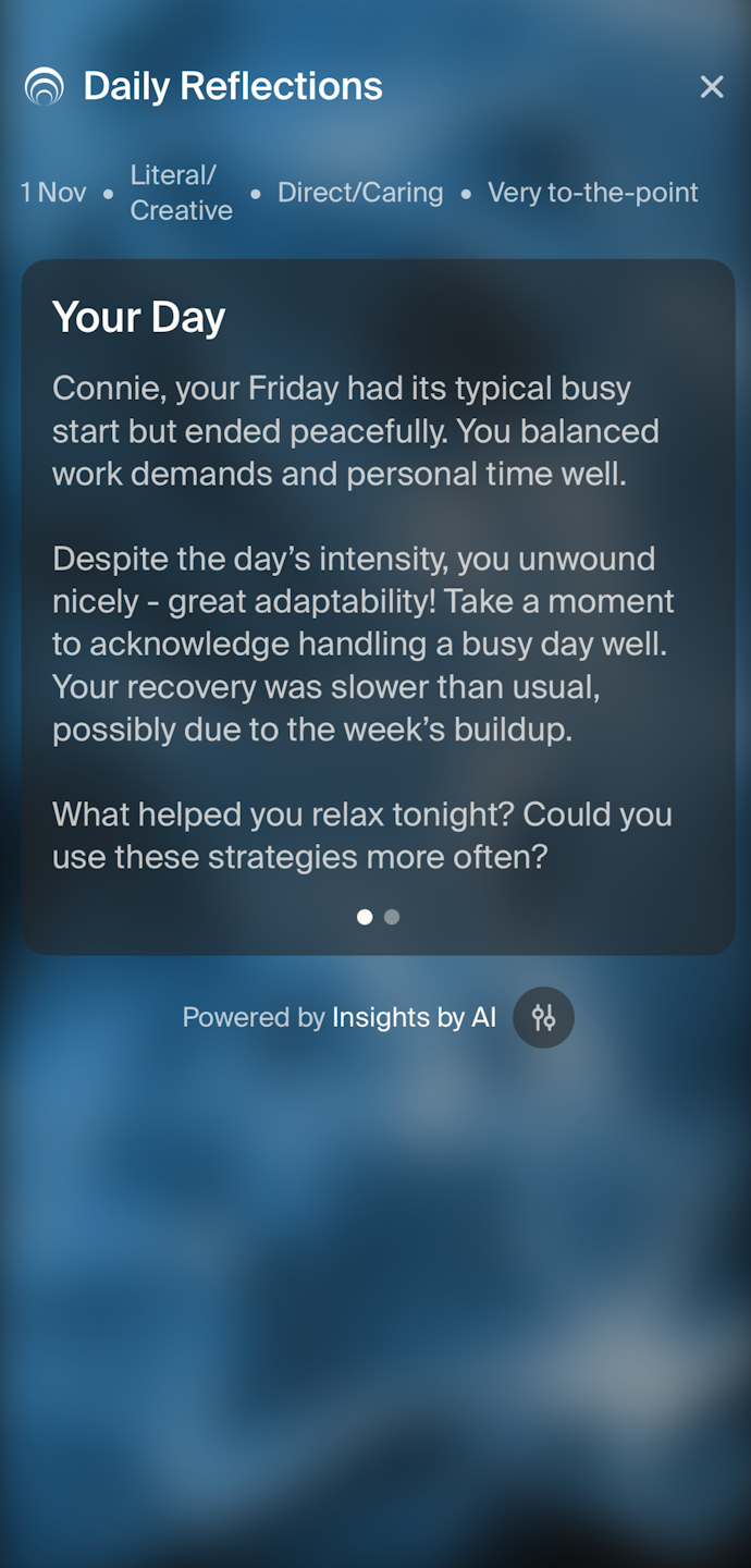 The Reflections feature is built as a companion to encourage and support you in reflecting on your day and data, helping you take control of your health.