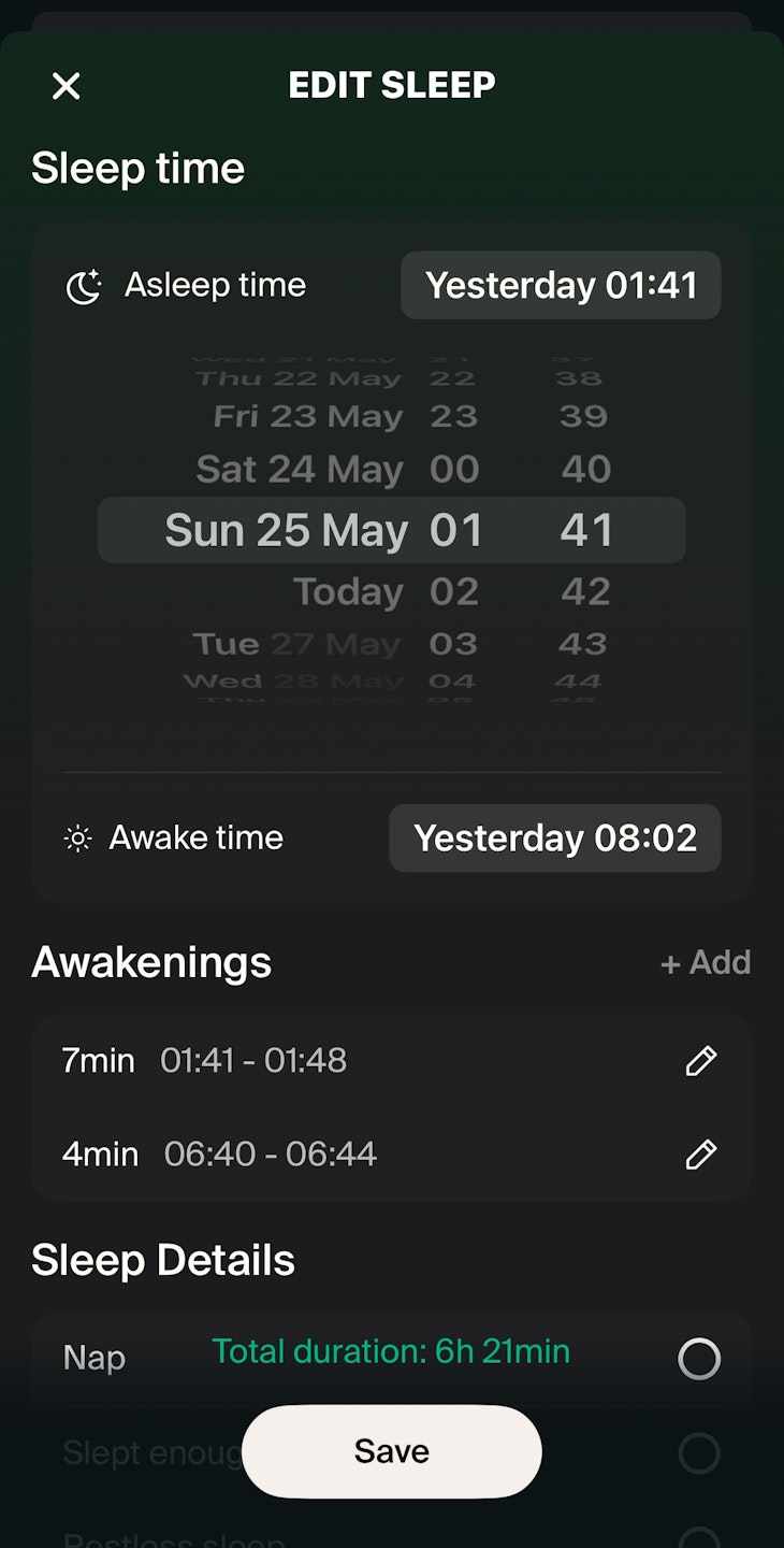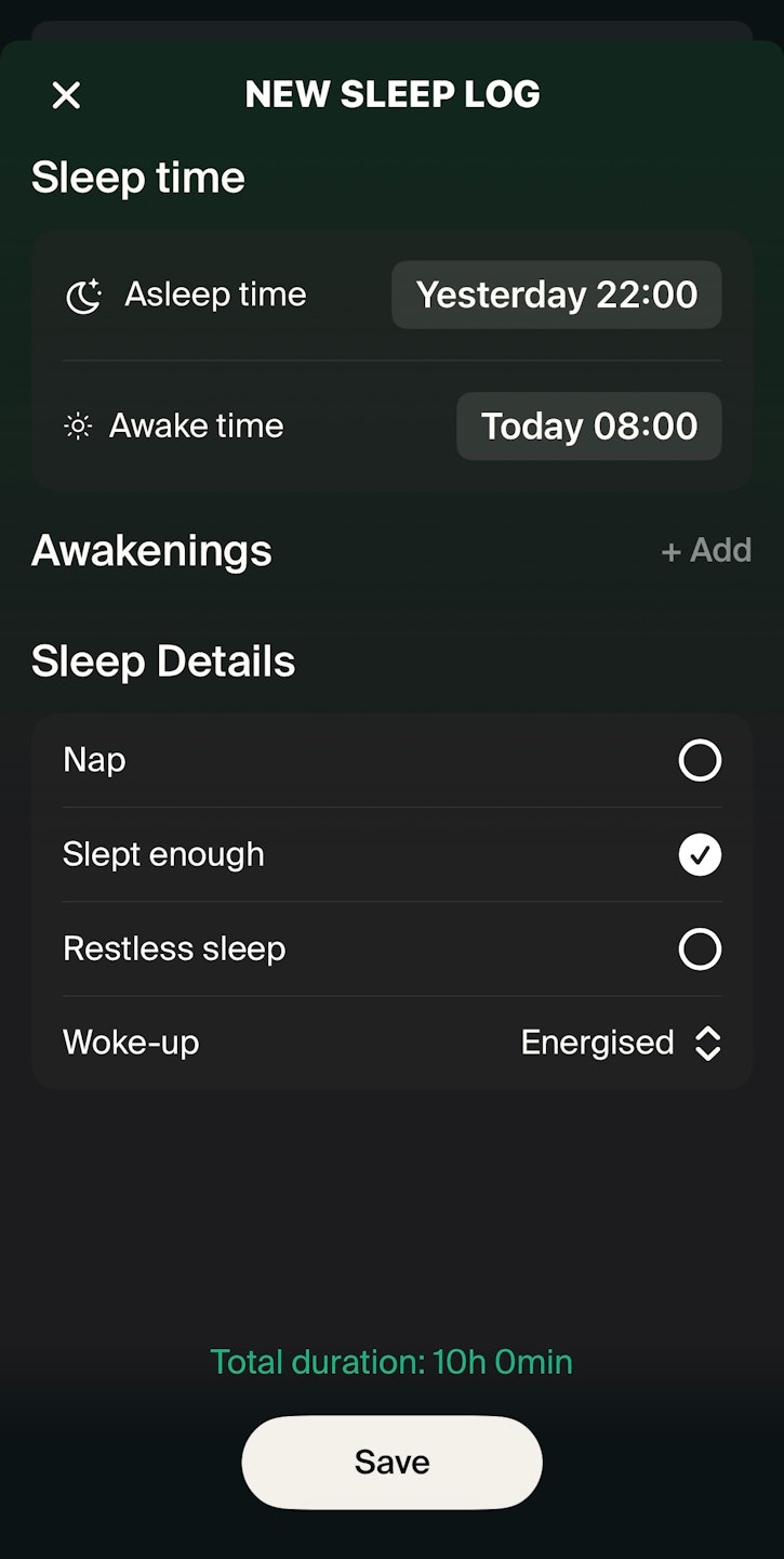 Adjust the asleep and awake times as needed. You can also add any awakenings, and include details such as whether it was a nap, if you felt you got enough sleep, whether your sleep was restless, and how you felt upon waking.