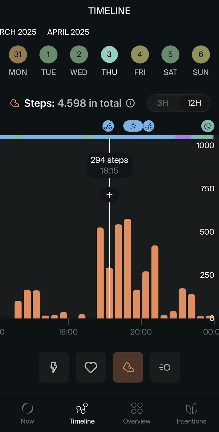 • Steps (shoe icon): Tap to view your Steps graph, displaying your total steps per half-hour period and your daily step count.