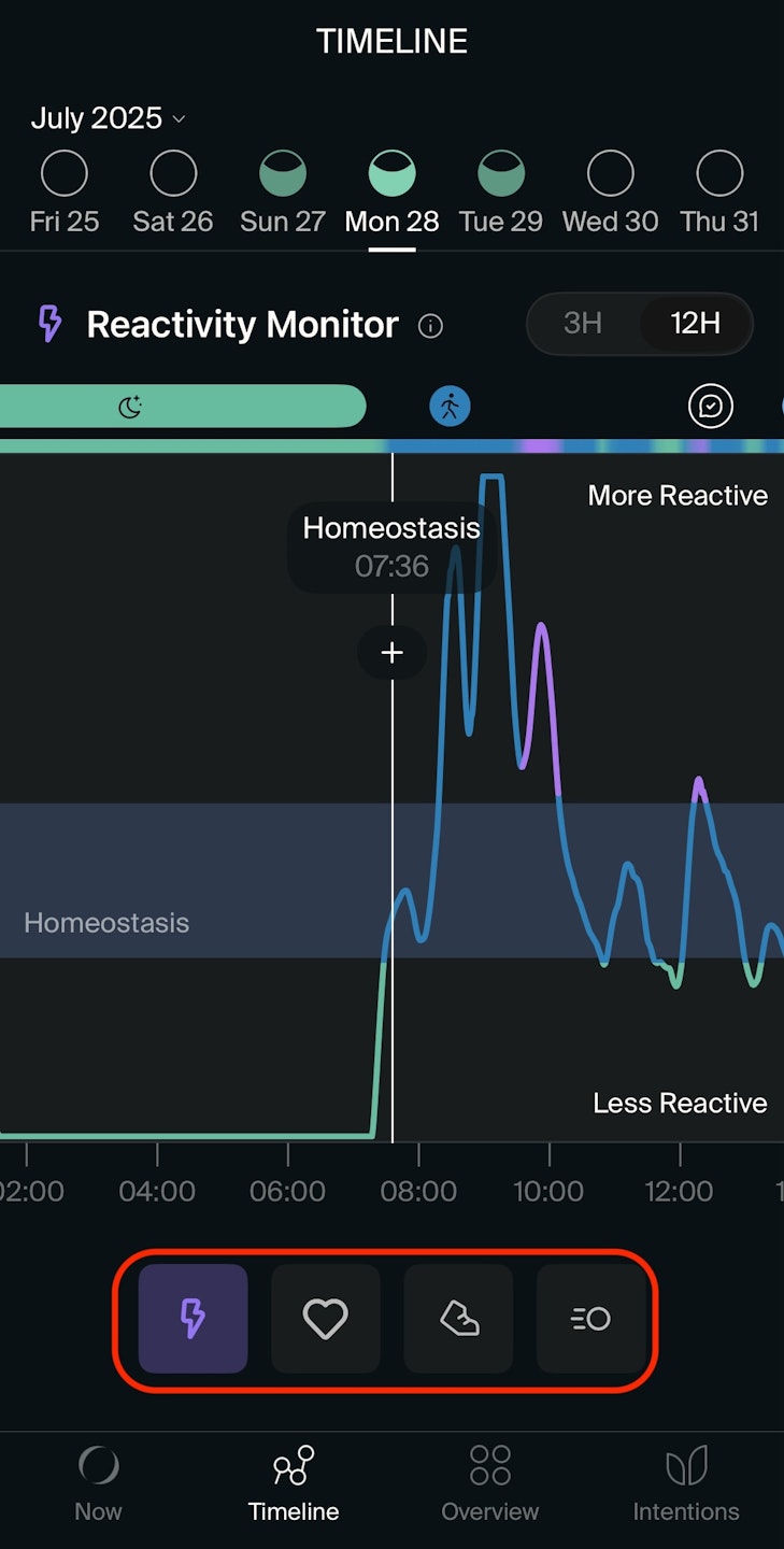 Reactivity Monitor (lighting icon): Tap to view your Reactivity Monitor graph, showing your reactivity scale (balanced, physically active, physically recovering, stress responses, less reactive, more reactive) across different times and days.
