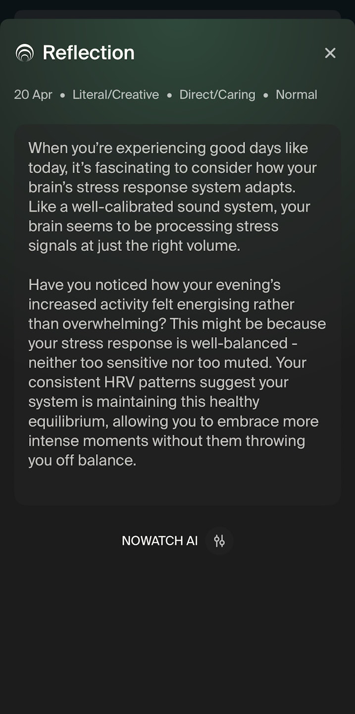 Subscription-Free App: The NOWATCH app is free to use, with no hidden costs or subscriptions, focusing instead on providing actionable insights to help you build stress resilience.